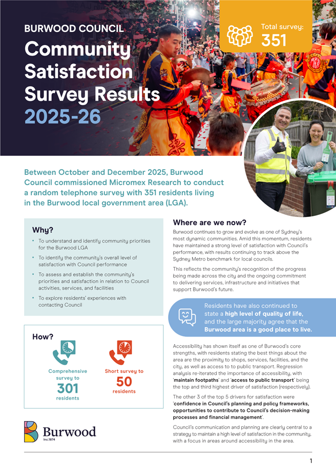 As Burwood continues to welcome new residents, understanding the community’s experience of the area remains essential. This survey provides an important snapshot of how people feel about living in Burwood and the role Council plays in supporting a vibrant, well-serviced and connected community. Overall, the findings reflect a community that remains positive about Council’s performance and the direction of the area, with satisfaction levels continuing to sit above the Sydney Metro benchmark.