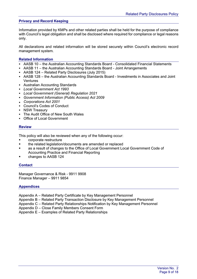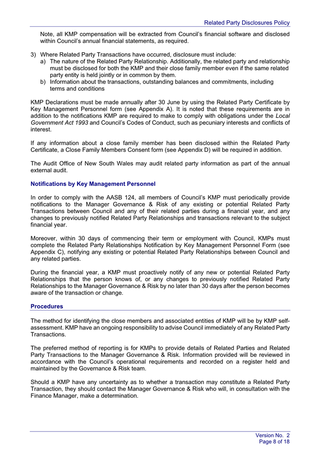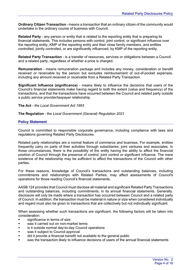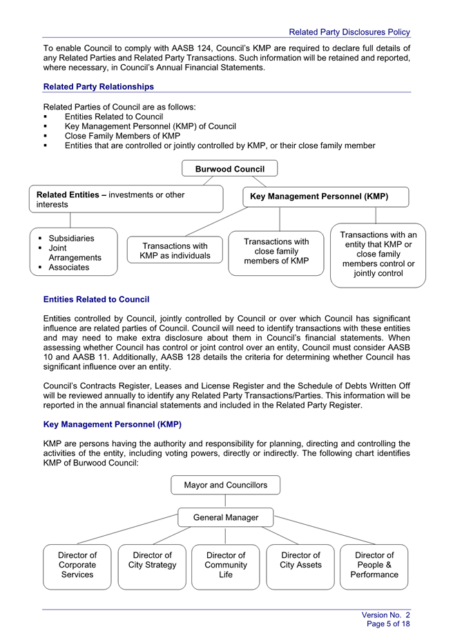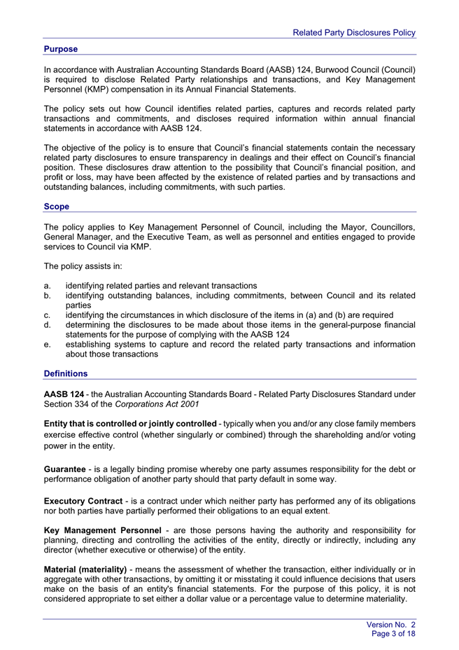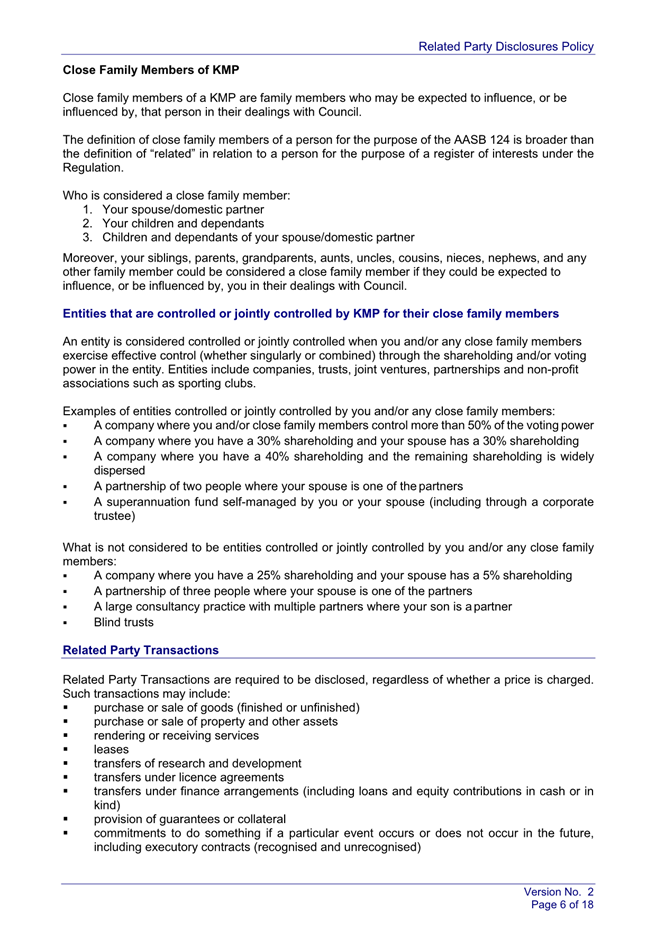 Under the Australian Accounting Standards, Council is required to disclose all related party relationships, transactions, and Key Management Personnel compensations in its Annual Financial Statements. The draft Policy sets out how Council identifies related parties, captures and records related party transactions and commitments, and discloses required information within annual financial statements in accordance with AASB 124.
