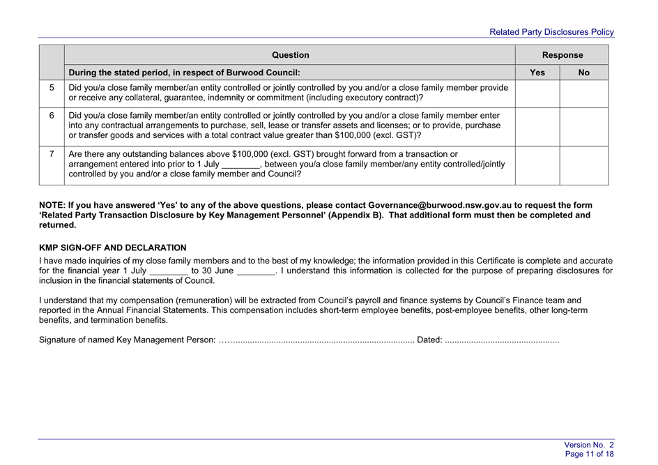 The draft policy is based on the current Related Party Disclosures Policy adopted in 2017 and has been reviewed to ensure alignment with the current Australian Accounting Standards. Despite no significant changes to the applicable Standards, the review identified several areas where updates would improve readability and, therefore, make it easier to comply with the Policy. The updated Policy clarifies definitions and reporting responsibilities, whilst simplifying the process and forms for managing disclosures.