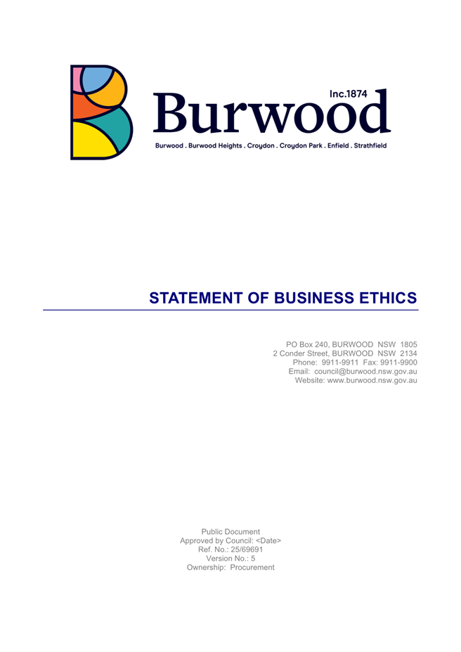The Statement of Business Ethics sets out Burwood Council’s standards and expectations for ethical, transparent and lawful business with our suppliers, contractors, consultants and partners. Council has published a Statement of Business Ethics since 2007, with the most recent Statement being thoroughly reviewed in 2018.
