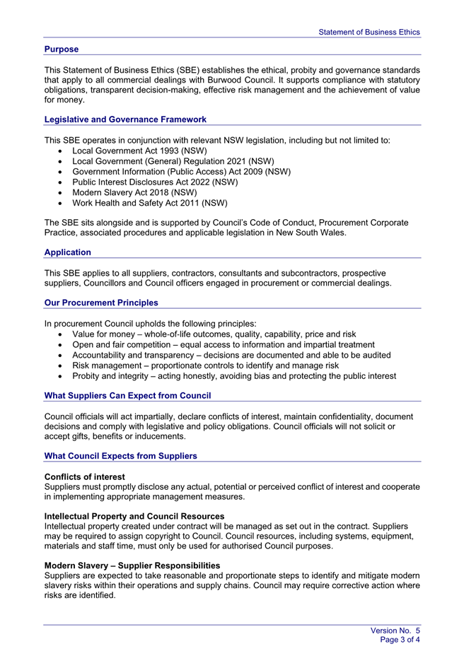 The proposed Statement reflects legislative and procurement practice changes since the last review. Adoption of the updated Statement will continue to support and encourage ethical procurement practices for Burwood Council.