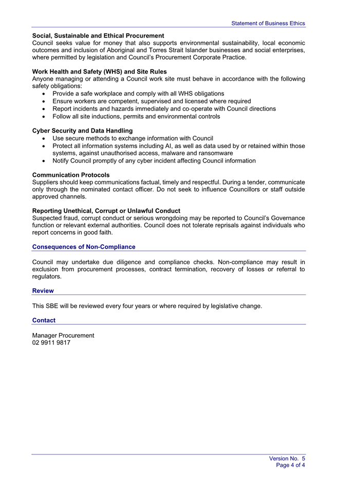 The Statement has now been reviewed and updated. The proposed Statement includes consideration of modern slavery legislation, emerging cyber security and information management risks, recommendations of ICAC investigations, and community expectations of social, sustainable and ethical procurement practices.
