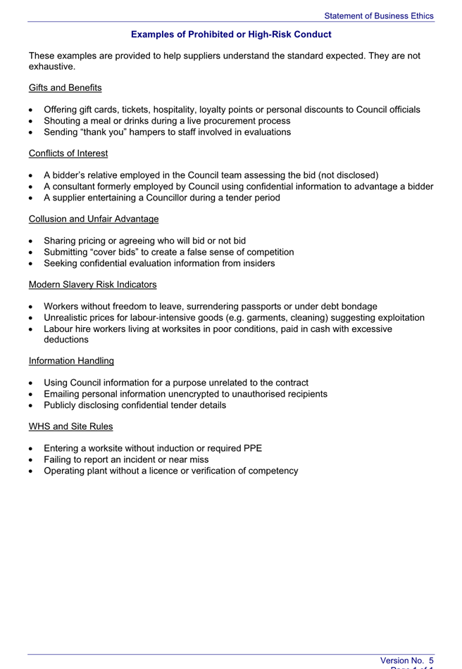 The Statement will be published on Council’s website alongside examples of prohibited or high-risk conduct. Suppliers will be required to read and sign a supplier declaration stating they have read and agree to the Statement of Business Ethics. Copies of those documents are provided for information.