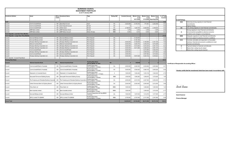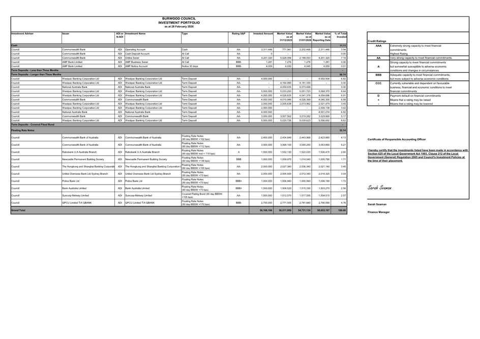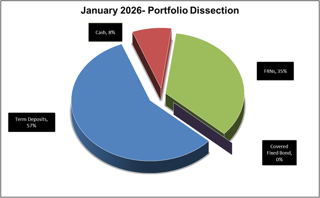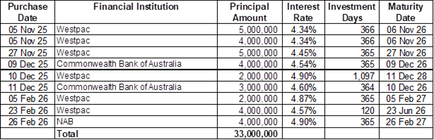 Council has a diversified investment portfolio and has a number of direct investments in term deposits. Its investment portfolio as at 31 January 2026 is: