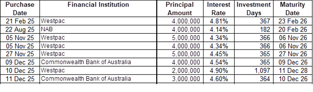 As at 31 January 2026 Council held the following term deposits: