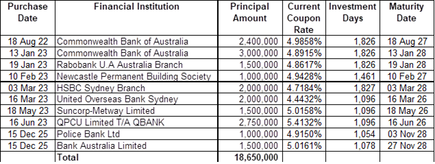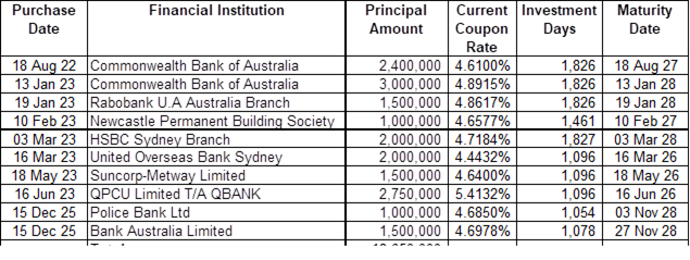 As at 28 February 2026 Council held the following Floating Rate Notes: